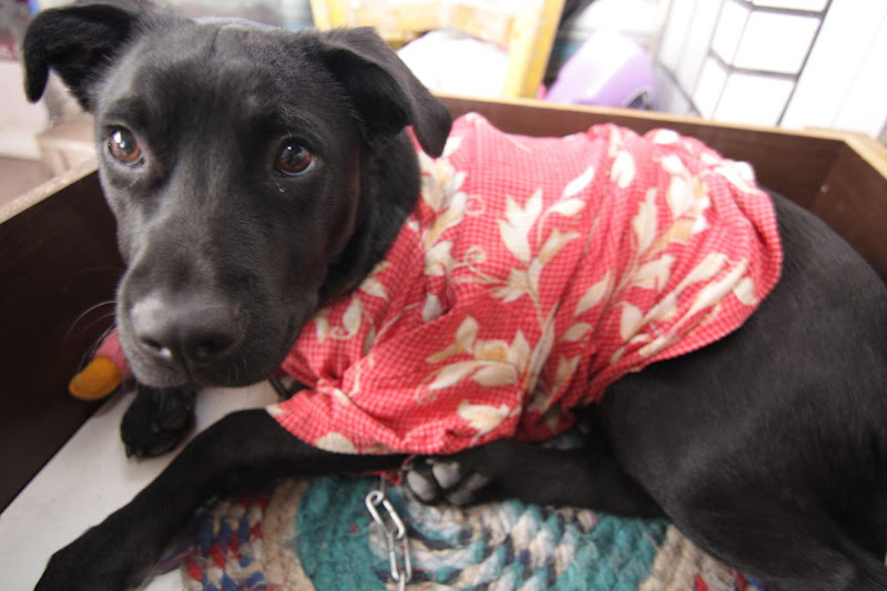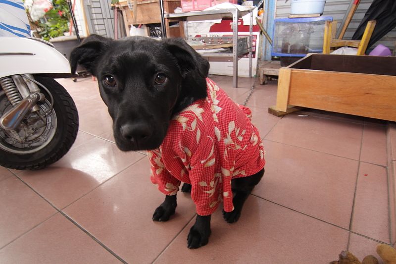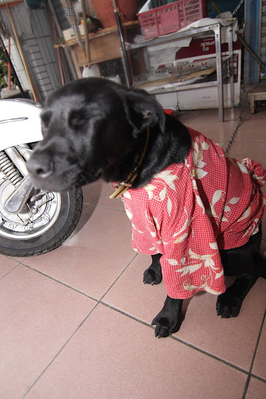 因為窮人家買不起狗衣服,所以阿母DIY用了一件超級娘砲的衣服給他穿