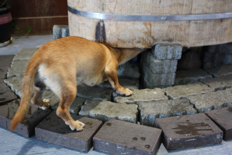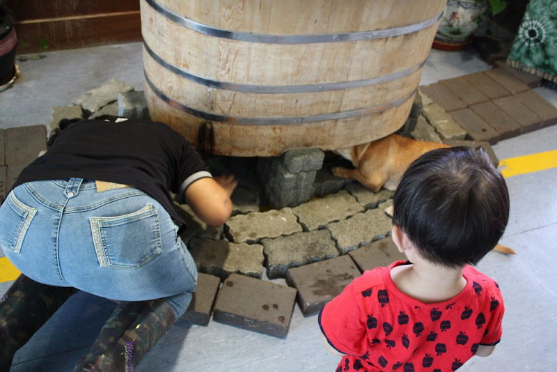 阿bibi馬上鑽進了放溫泉魚的木桶底部,好像要咬什麼東西